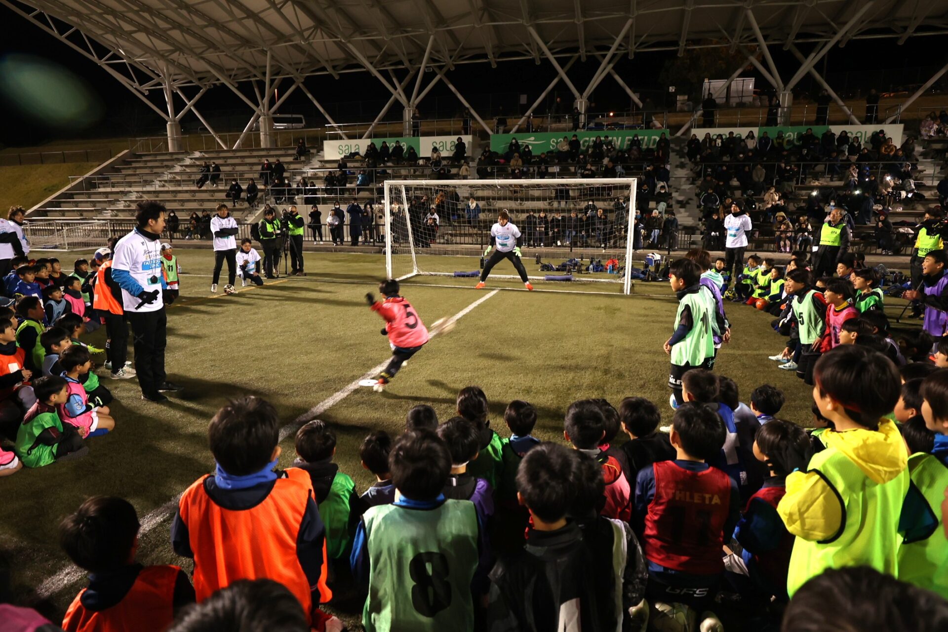 最後には各コーチと子供たちでチームを結成、選抜された子供たちが実際にPK合戦を行い、緊張感もありながら、とても盛り上がる対決となりました。楽しみながら、難しさを知る、本イベントの主旨に合う有意義な時間になりました。